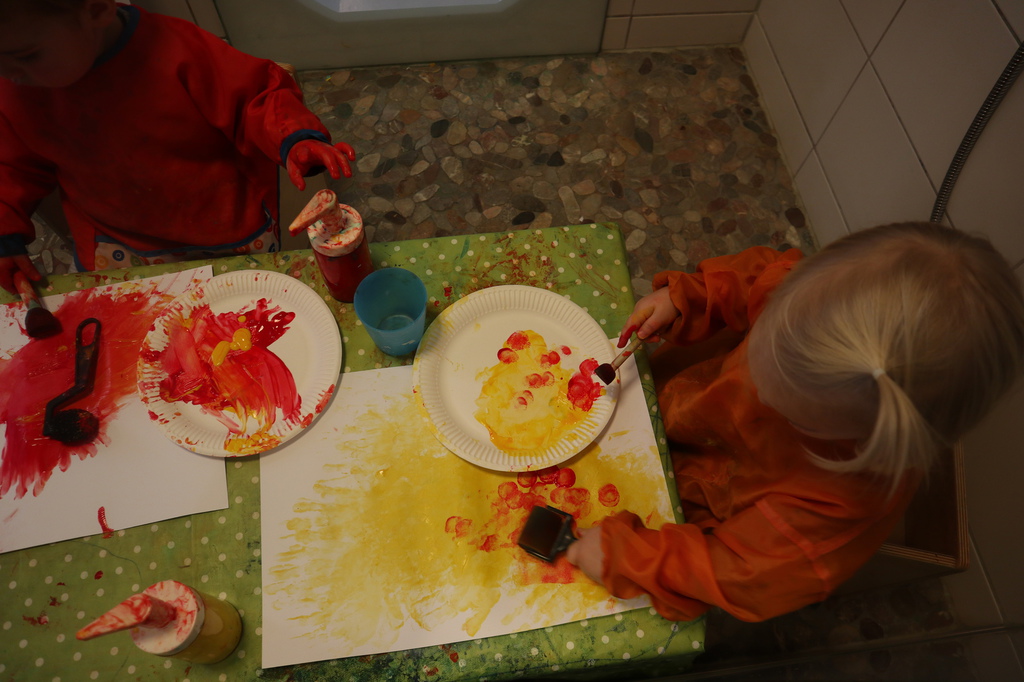 Ob mit Wasserfarben, Fingerfarben, Buntstiften oder Filzstiften – die Kinder malen, schneiden, kleben und gestalten ihre eigenen kleinen Kunstwerke. Auch das Kneten und Formen mit Knete oder Ton